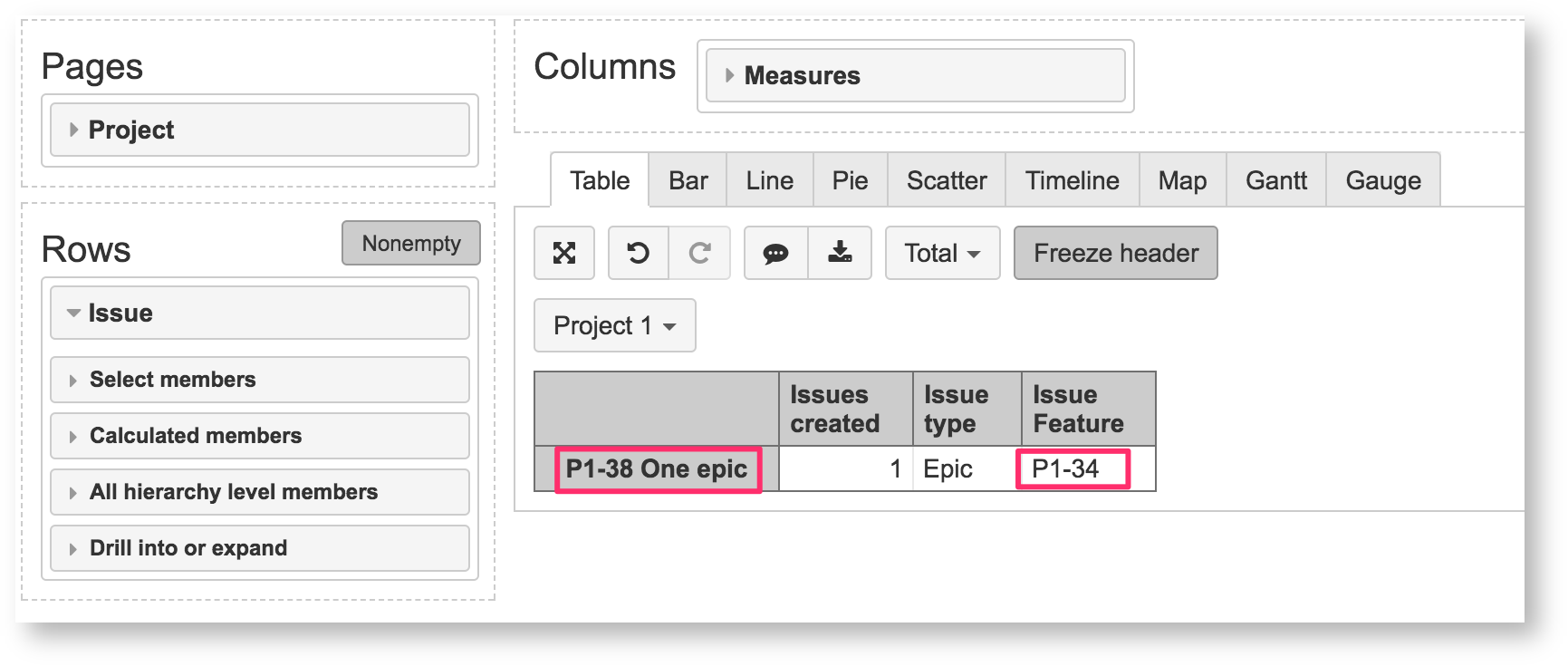 Now if you will select and import the Feature custom issue link field then also the corresponding additional Feature hierarchy will be defined for the Issue dimension.