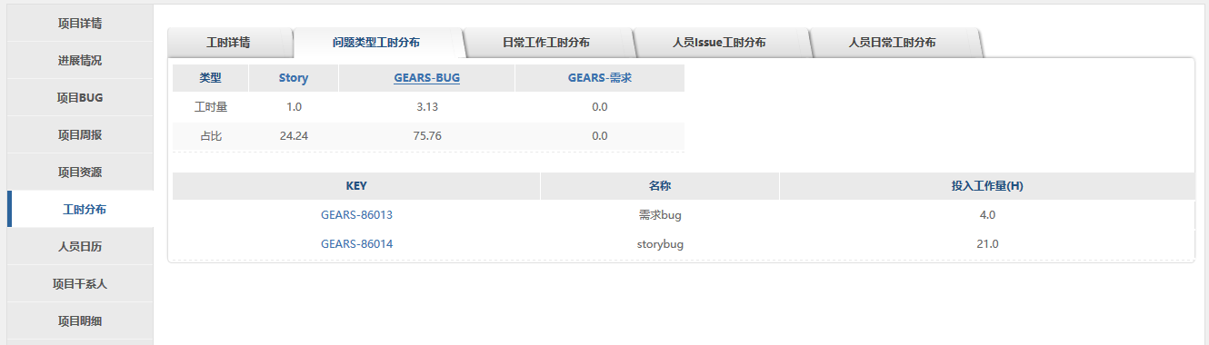 可以在问题类型工时分布Tab页中,了解每类问题工时的投入情况,点击具体的问题类型可以查看到登记到这些问题类型上的工时明细