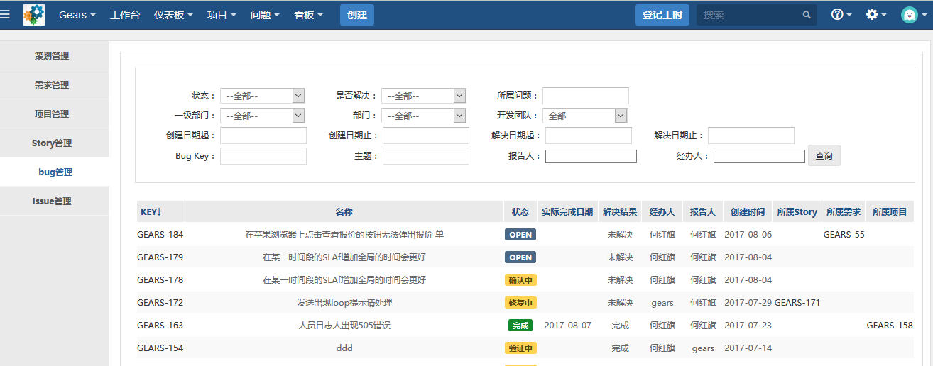 BUG管理菜单主要用对系统中的GEARS-BUG的问题(issue)进行查询