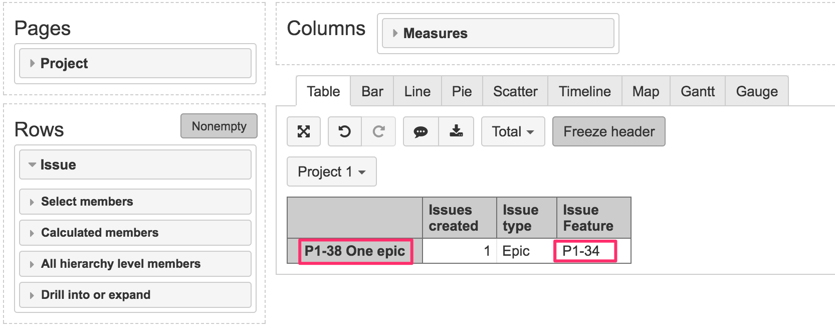 In Issue dimension Epic hierarchy, epics are split by projects based on their stories, therefore, epics could be included in the report more than once. To avoid splitting them by projects and, meanwhile, use benefits of Issue dimension Epic hierarchy, you can define Issue dimension Epic hierarchy without project level.